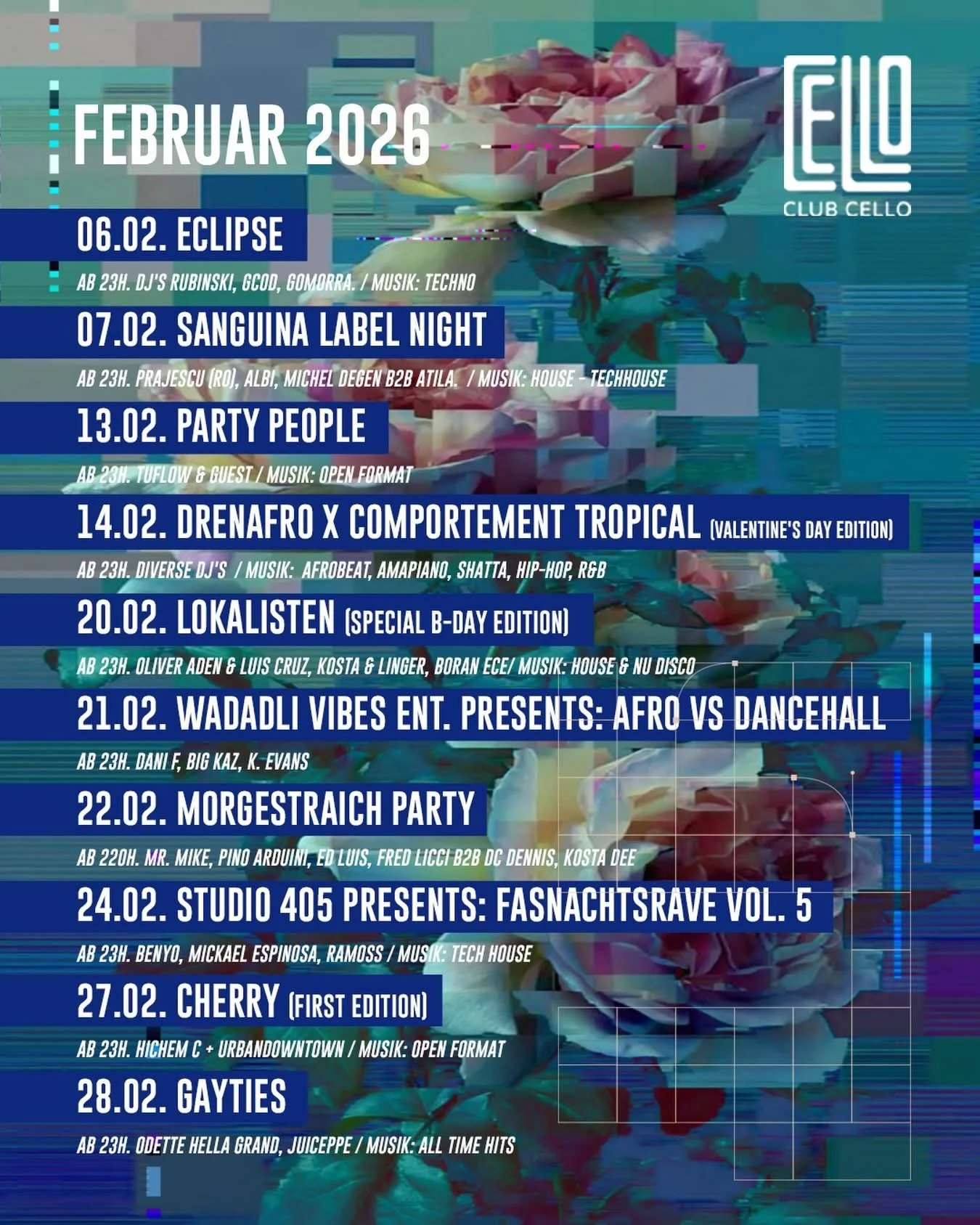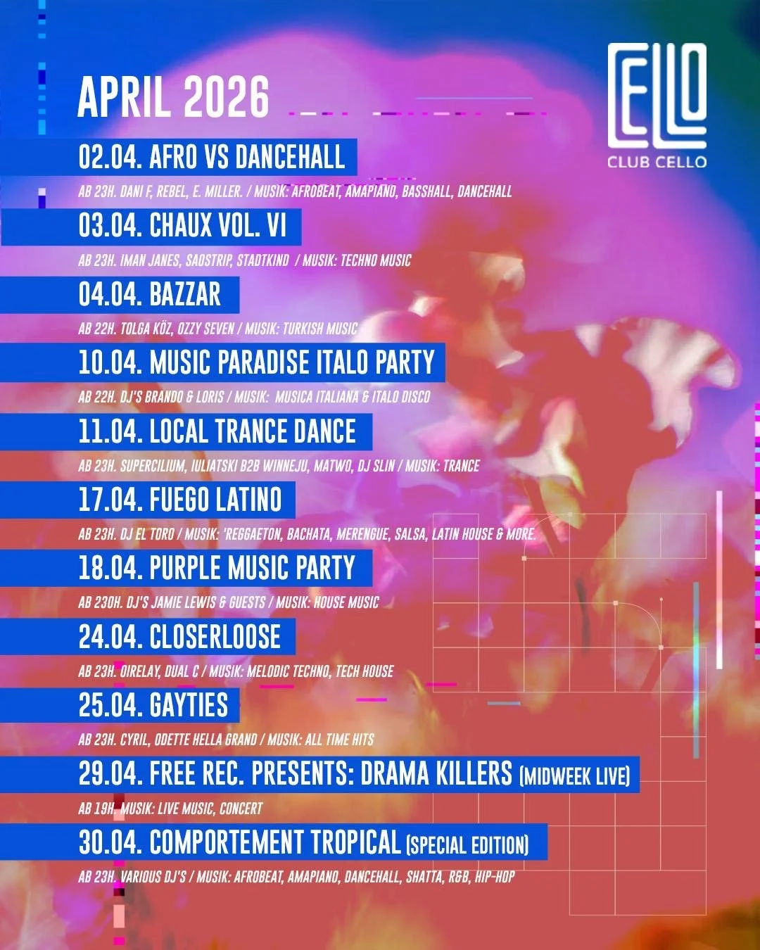 Der Basler Marktplatz ist fortan nicht nur tagsüber pulsierendes Zentrum der Stadt, sondern auch Hot Spot des lokalen Nachtlebens. Der club cello, lässt die traditionsreiche Location an der Ecke gegenüber dem Rathaus in neuem Glanz erstrahlen und bietet zeitgemässes High-End Clubbing in allen Facetten. Ein abwechslungsreiches Musikprogramm, gepaart mit einem Barangebot höchster Qualität und zwanglosem Ambiente, erfüllt Weekend für Weekend die höchsten Ansprüche an spektakuläres Feiern ohne Kompromisse!